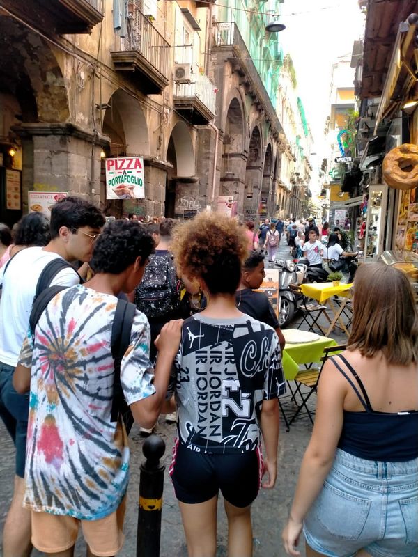 “Napoli è bellissima, sembra una città finta con i vicoletti e le statuine su tutti i balconi, l’odore di cibo dappertutto e poi la pizza… ma che pizza fanno? Morbida, gustosa, ne avrei mangiate altre dieci!”Francesco*, 17 anni.